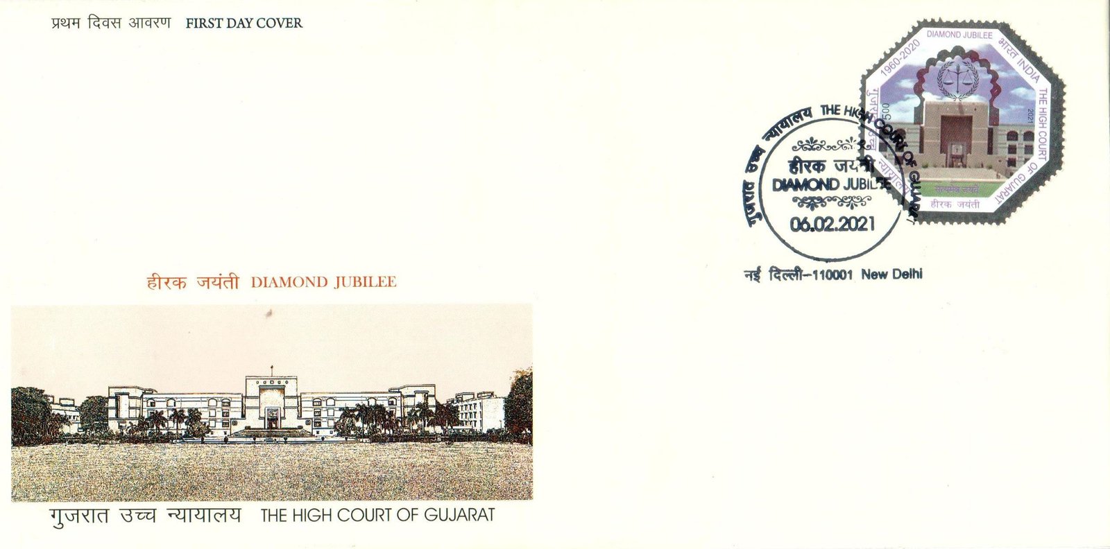 To mark its Diamond Jubilee in 2020, the High Court of Gujarat conceptualized a unique diamond-shaped Commemorative Postage Stamp. The stamp depicts the front façade of the High Court building, with the Scales of Justice embedded at the top and the Court’s emblem engraved prominently. The border carries the inscriptions in Hindi and English: